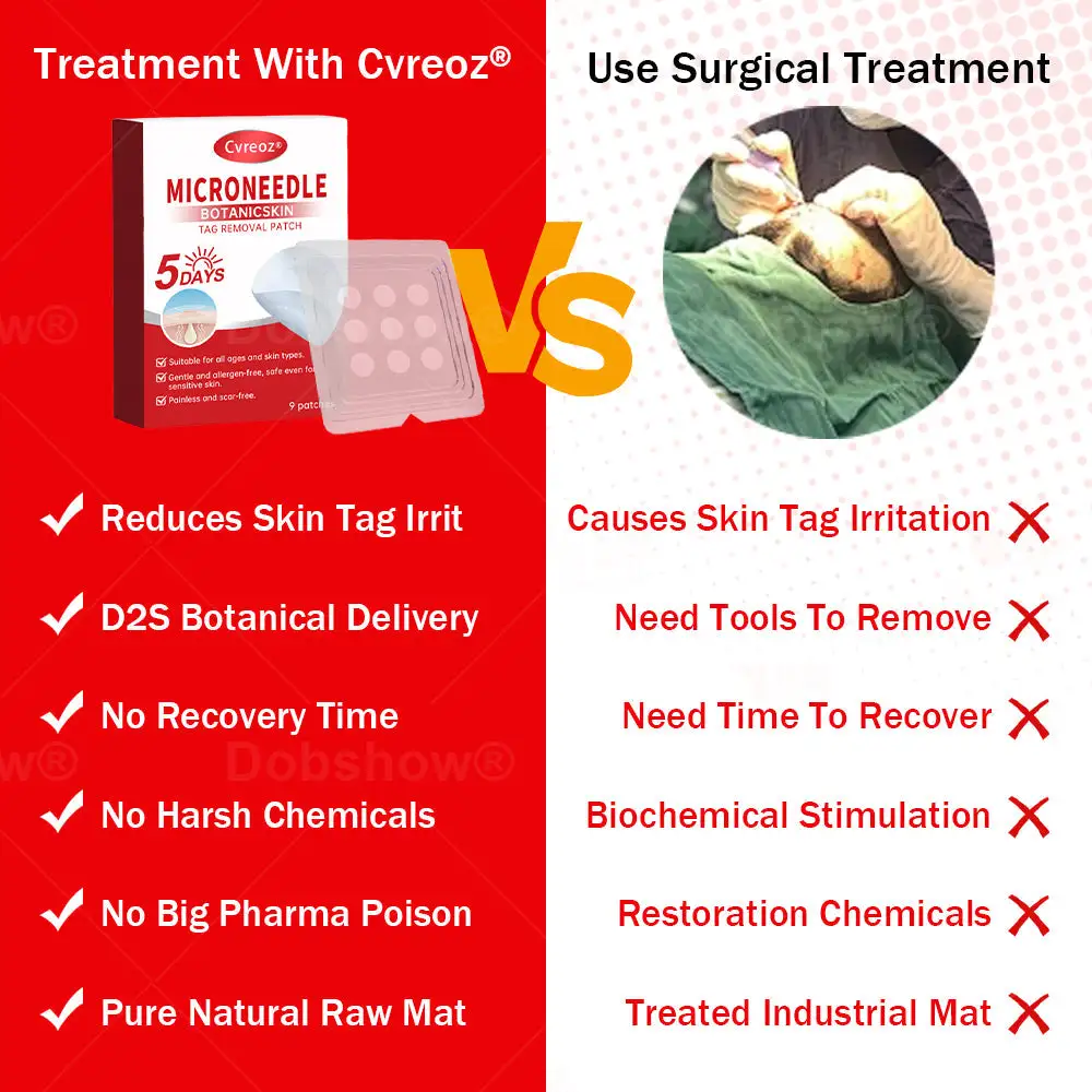 Cvreoz® MicroNeedle Botanic Skin Tag Removal Patch is the first patented direct-to-skin delivery system with advanced botanical technology for treating skin tags at home. Thanks to its innovative Plant-Based Micro-Delivery Technology, it penetrates up to 300% deeper into skin tissue compared to conventional methods, showing visible results within 48–72 hours. Skip costly procedures and care for your skin long-term — easily and comfortably from home.